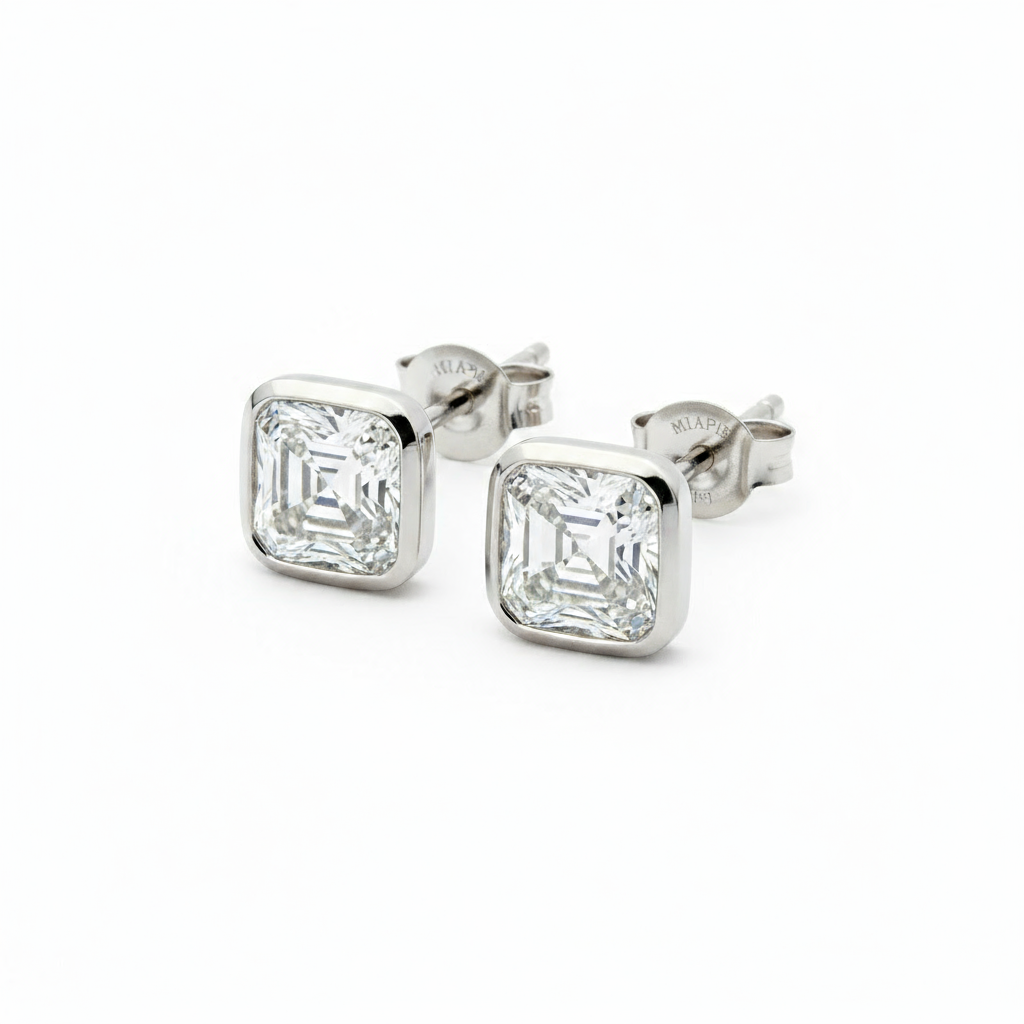 Miapia’s 1.5-Carat Asscher Cut Bezel Studs bring a touch of vintage charm with a modern edge. Each Asscher-cut moissanite is elegantly enclosed in a sleek bezel setting, crafted from rhodium-plated sterling silver to enhance its clean lines and geometric brilliance. Designed for timeless appeal, these demi-fine studs are perfect for daily wear or as a sophisticated finishing touch for any occasion.