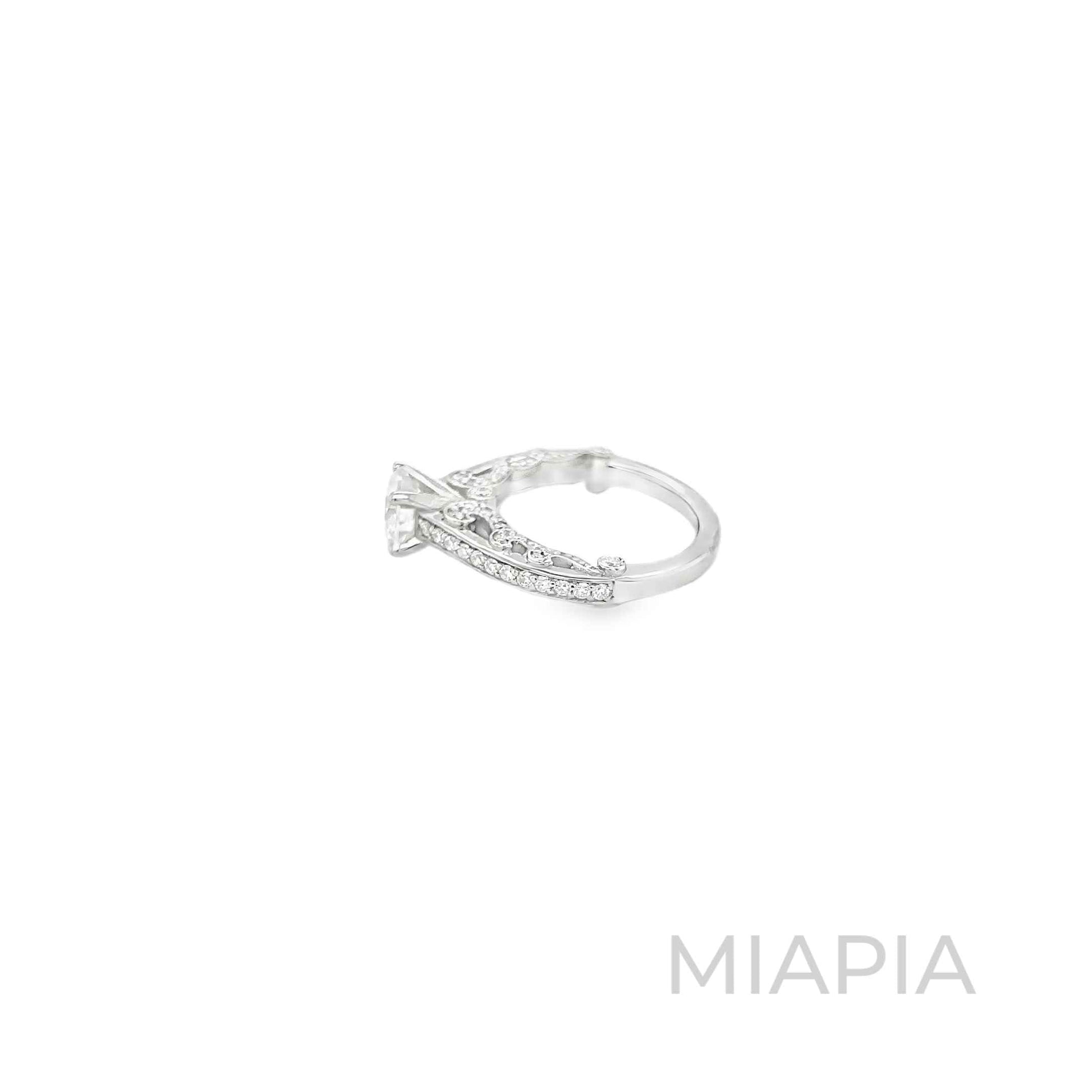 The Ethereal Embrace Ring from Miapia radiates timeless sophistication. This design features a brilliant round moissanite diamond set in rhodium-plated sterling silver, complemented by delicate pave-set moissanites along the band. Intricate detailing on the shank adds a touch of vintage charm, making this demi-fine piece perfect for engagements, celebrations, or elevating everyday elegance. A symbol of love and craftsmanship, the Ethereal Embrace Ring captures the essence of Miapia’s sustainable luxury.