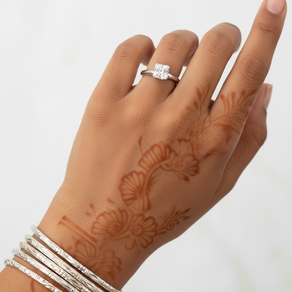 Add a touch of modern elegance with Miapia’s 3/4 Carat Princess Cut Solitaire Ring. Featuring a radiant princess-cut moissanite set in a refined four-prong design, this demi-fine masterpiece is crafted in rhodium-plated sterling silver for lasting brilliance. The minimalistic band accentuates the stone’s sharp geometry, making it perfect for both daily wear and special celebrations.
