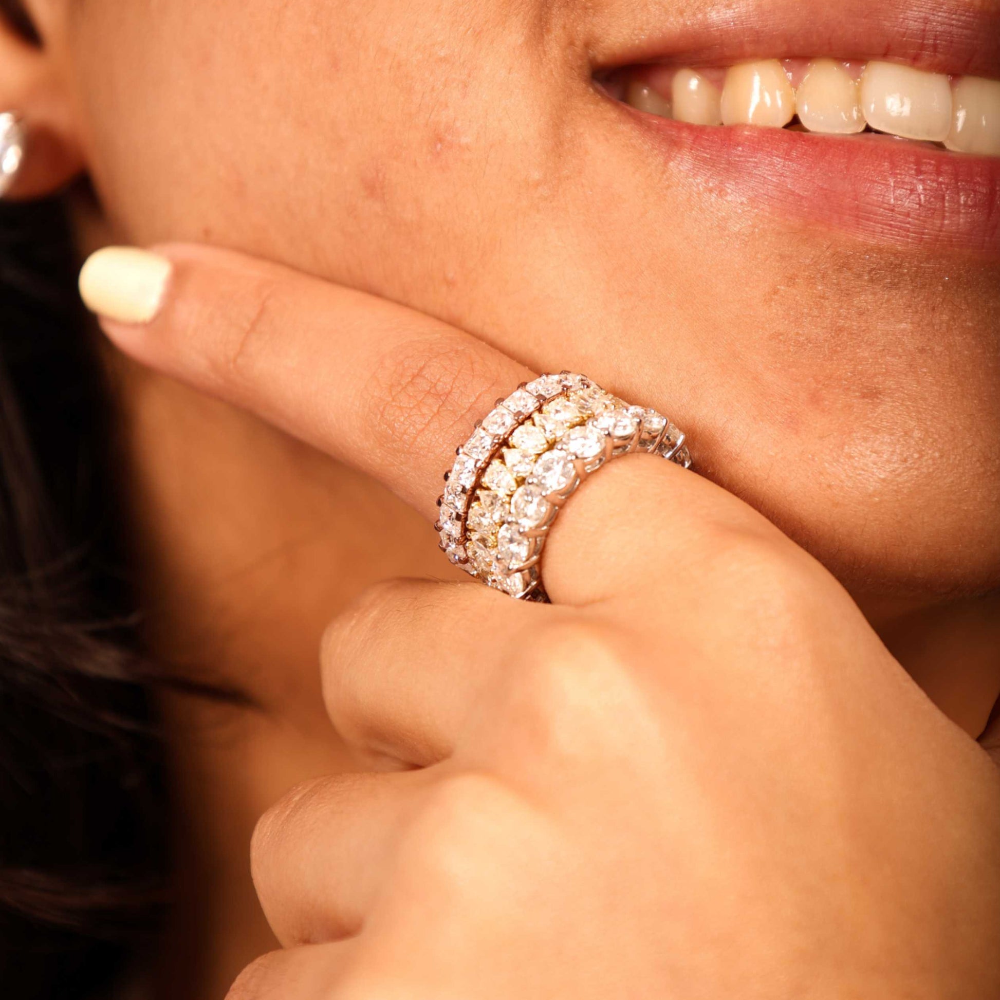 The Classic Rounds Eternity Ring by Miapia showcases a seamless band of round-cut moissanites, each meticulously set in rhodium-plated sterling silver. Designed for timeless sparkle and enduring elegance, this ring is perfect for stacking, gifting, or celebrating your cherished milestones. A true testament to Miapia’s commitment to crafting demi-fine jewelry that blends luxury and versatility.