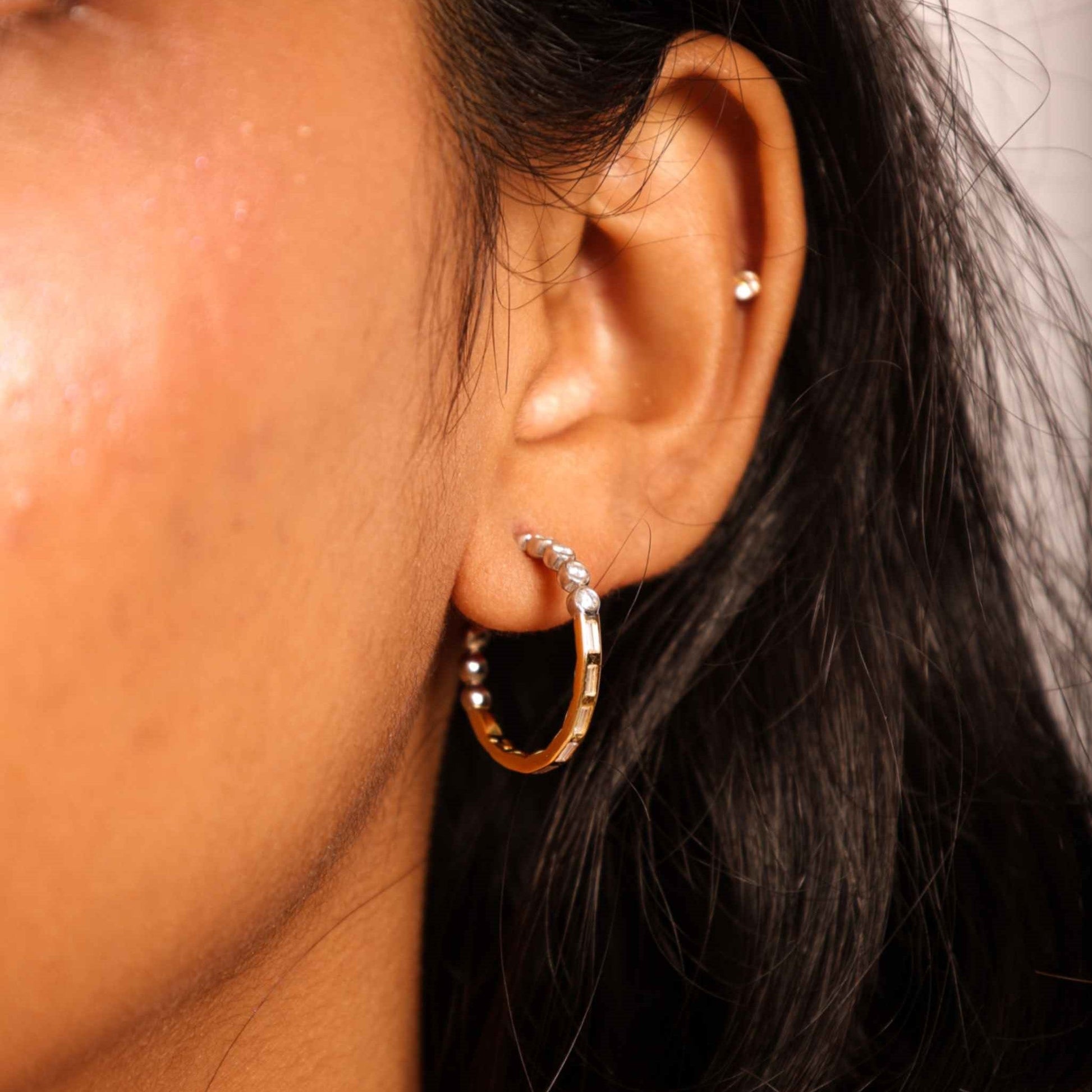 Embrace the art of contrast with the Duo Charm Mosaic Hoops – an eclectic blend of textures and tones that create a truly captivating piece. These hoops feature a vermeil gold frame interspersed with a mosaic of bezel-set moissanite diamonds in rhodium-plated sterling silver settings, creating a dynamic interplay between polished gold and shimmering silver. The design alternates between structured gold links and round, rhodium-plated silver-set moissanites, making these hoops both bold and versatile. Ideal for those who appreciate statement pieces with a refined edge, the Duo Charm Mosaic Hoops are crafted with sustainable sterling silver and vermeil gold, ensuring both elegance and durability. Perfect for adding a modern twist to any look, from casual chic to evening glam.