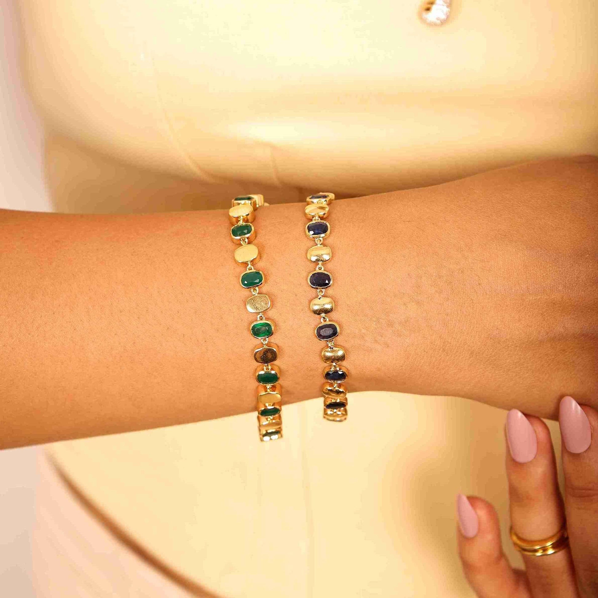 The Emerald Allure Bracelet by Miapia exudes timeless sophistication with a modern twist. Crafted in vermeil gold over sterling silver, this bracelet showcases a series of oval-cut green gemstones framed by soft, organic gold shapes. Perfect for elevating your everyday look or adding a touch of elegance to evening wear, this piece reflects Miapia’s dedication to creating sustainable and luxurious demi-fine jewellery.