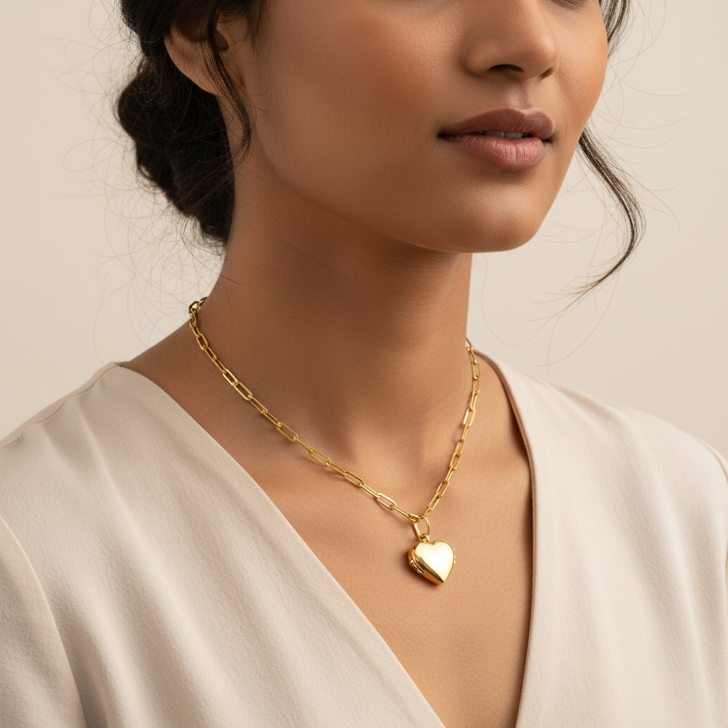 Cherish your precious moments with the Eternal Love Heart Locket. This elegant piece, crafted in vermeil gold, features a classic heart silhouette that opens up to hold a cherished memory or keepsake. Designed with smooth, polished surfaces for a timeless look, this locket is suspended on a delicate paperclip chain, adding a modern touch to its traditional charm. Perfect as a heartfelt gift or a personal statement of love, this piece is an exquisite blend of sentimentality and style.