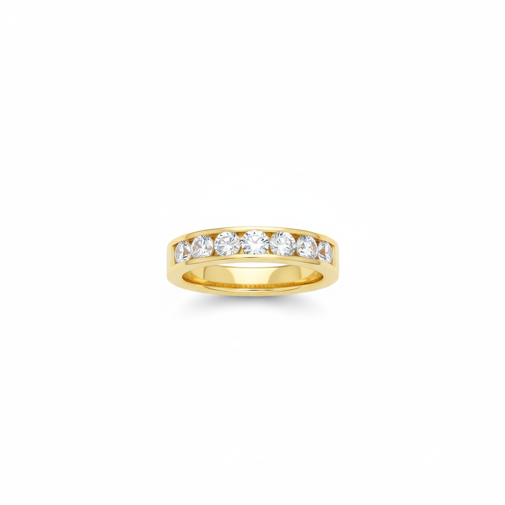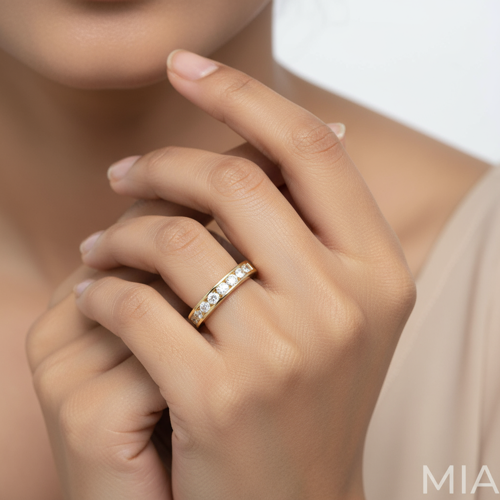 Celebrate timeless elegance with Miapia’s Eternal Spark Band, a true testament to refined craftsmanship. This exquisite ring features a seamless row of dazzling moissanite diamonds, set on a sleek band of vermeil gold over sterling silver. Perfectly designed for stacking or wearing alone, this demi-fine jewelry piece adds a subtle brilliance to any occasion, from casual outings to special celebrations. A versatile addition to your jewelry collection, the Eternal Spark Band embodies understated sophistication.