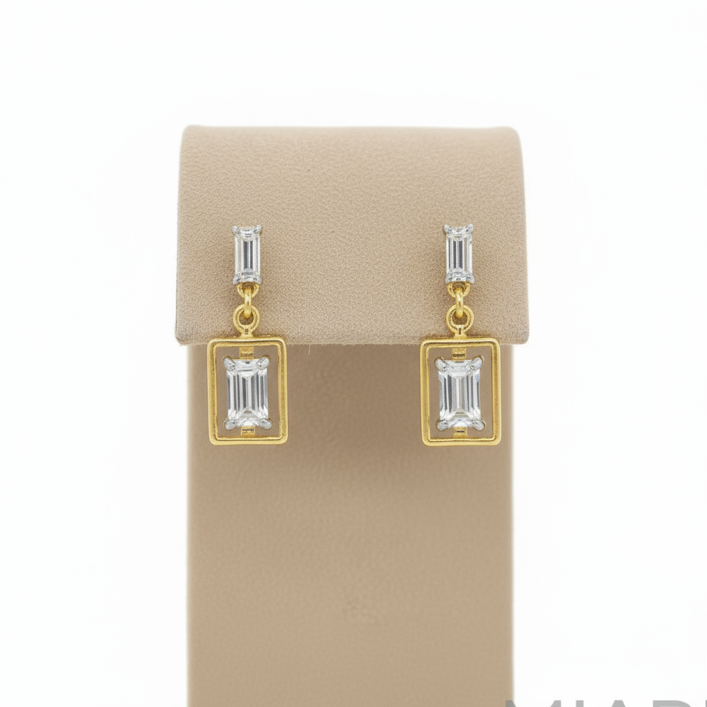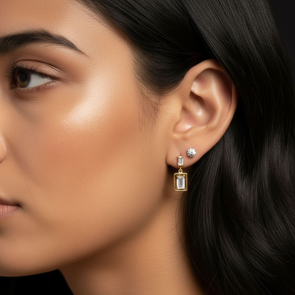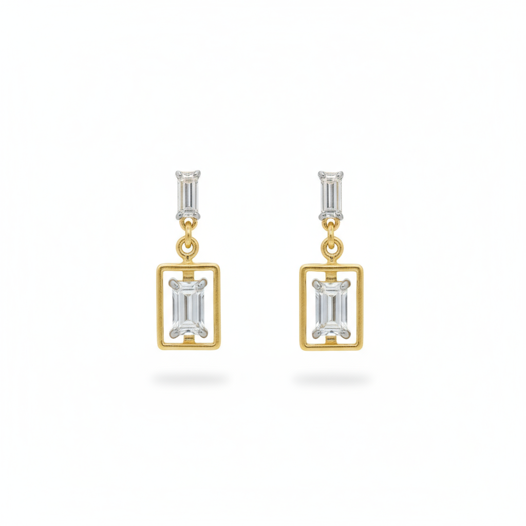 The Frame of Light Danglers are a striking blend of architectural charm and refined elegance. Featuring a baguette-cut moissanite framed in vermeil gold, each earring is accented by a petite moissanite stud for added brilliance.