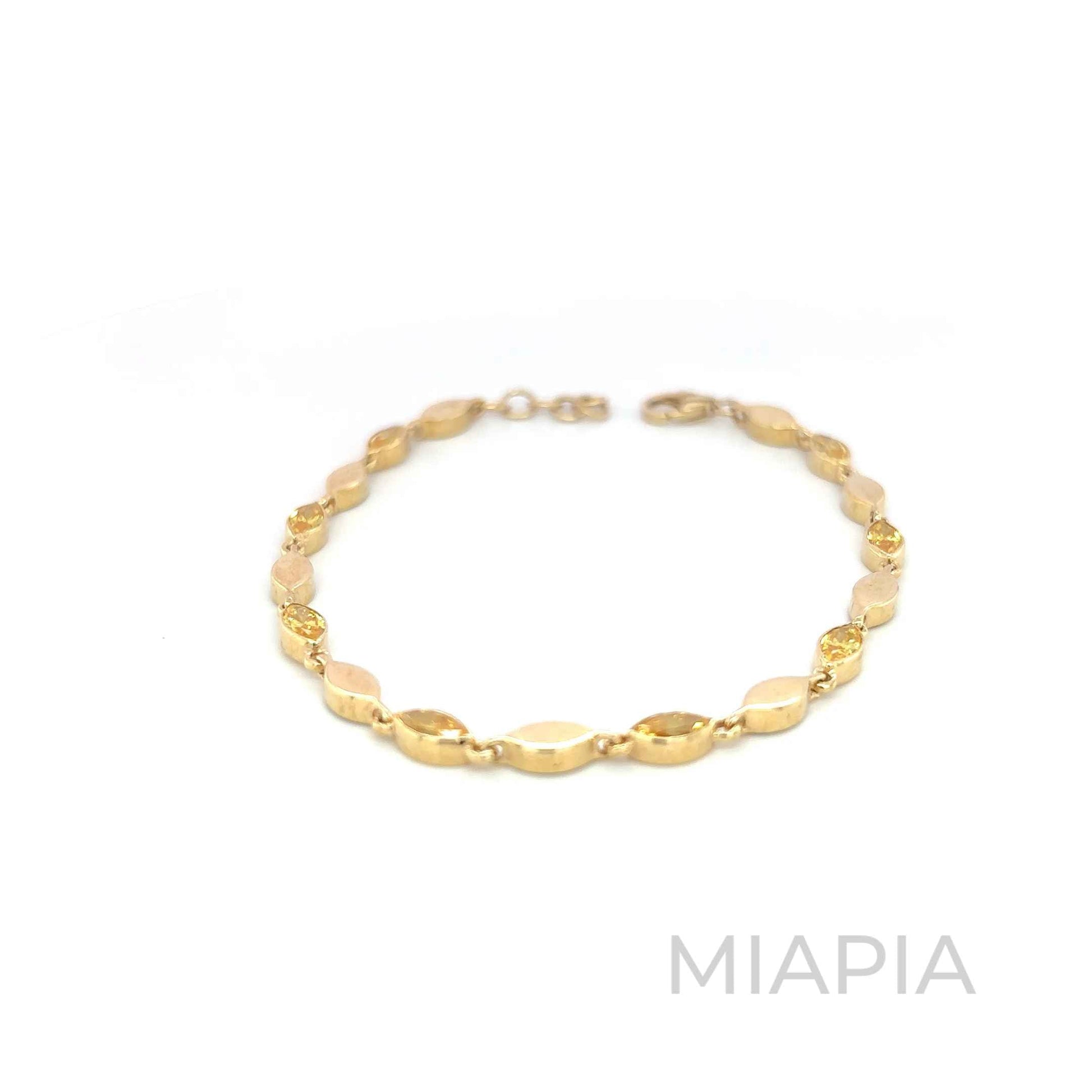 The Gilded Marquise Bracelet by Miapia is a testament to timeless elegance. Featuring an exquisite pattern of alternating polished and yellow marquise-shaped gemstone links, this bracelet is crafted in vermeil gold over sterling silver, exuding sophistication and charm. Its delicate design offers a versatile piece that seamlessly transitions from casual elegance to formal grace. Perfect as a standalone statement or layered with other Miapia creations, this demi-fine treasure will elevate any look with its luxurious simplicity.