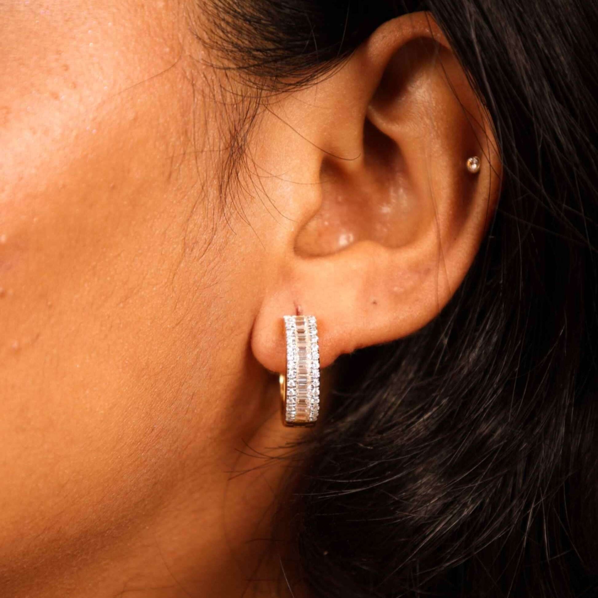The Glacier Luxe Huggies from Miapia redefine elegance with their radiant simplicity. Crafted from rhodium-plated sterling silver, these earrings feature two rows of dazzling moissanite diamonds with a row of baguette moissanites in the centre that exude timeless sophistication. Their compact design offers versatility, making them perfect for both everyday wear and evening occasions. A seamless blend of modern design and classic allure, these demi-fine jewellery pieces highlight Miapia’s commitment to sustainable craftsmanship and luxury.