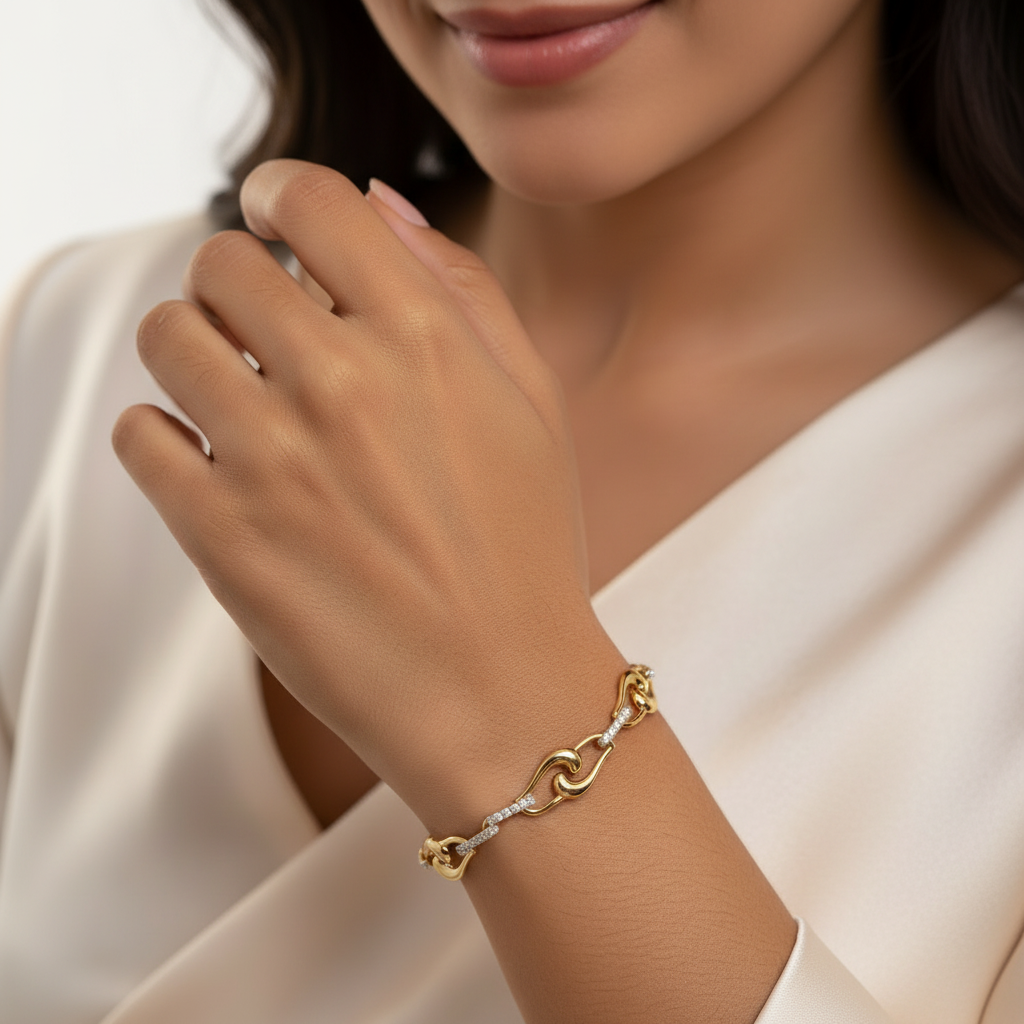 Experience effortless sophistication with the Intertwined Elegance Bracelet by Miapia. This design features fluid, interlocked links adorned with pavé-set moissanite diamonds for a touch of radiant sparkle. Crafted in vermeil gold over sterling silver, the bracelet strikes a perfect balance between modern artistry and timeless charm. Ideal for special occasions or everyday luxury, this demi-fine jewelry piece embodies Miapia’s signature commitment to sustainable materials and exquisite craftsmanship.