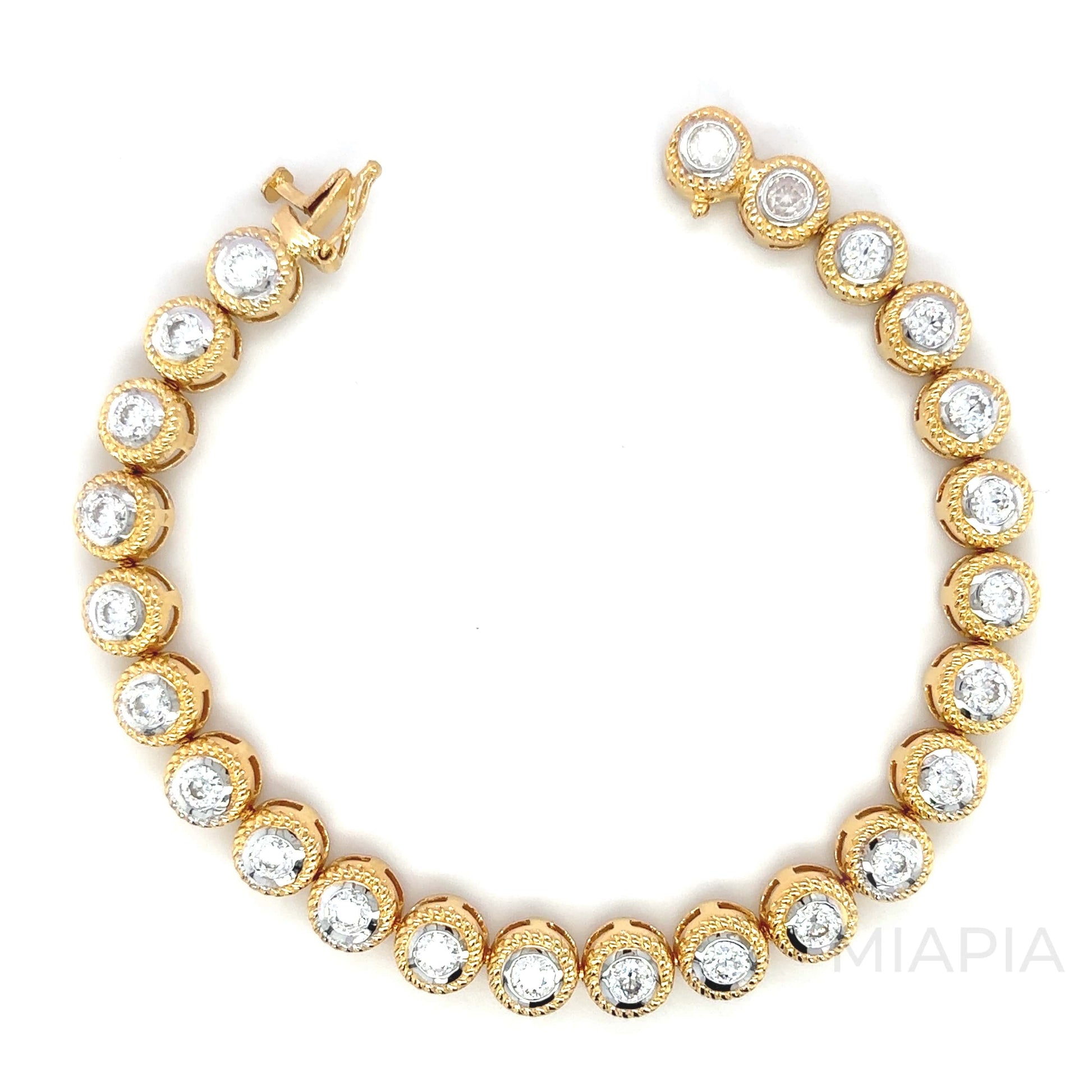 Elevate your jewellery collection with the Lustra Tennis Bracelet by Miapia. This design features a flawless arrangement of shimmering moissanite diamonds, each embraced by luxurious vermeil gold over sterling silver. Its timeless silhouette is crafted to exude grace, making it a versatile piece for both everyday refinement and special occasions. A sustainable masterpiece, this bracelet showcases Miapia’s commitment to creating demi-fine jewellery with a touch of elegance and enduring style.