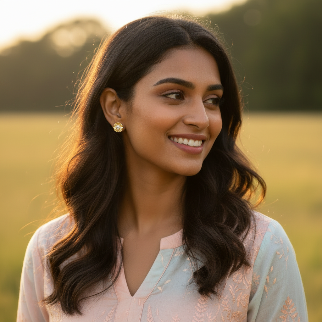 Add a flourish of elegance to your look with the Lustre Bloom Studs, a symbol of understated luxury and sustainable craftsmanship.