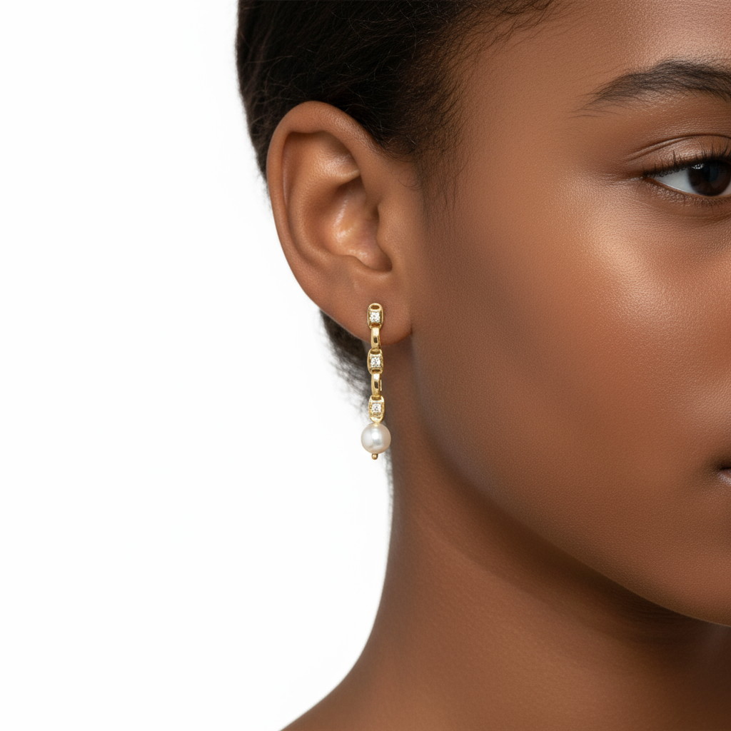 Elevate your look with the Luxe Cascade Drops, a striking blend of geometric elegance and timeless sophistication. These earrings feature a vertical chain of shimmering vermeil gold links, each delicately framing moissanite accents, leading to a single luminous pearl drop that adds a touch of refinement.
