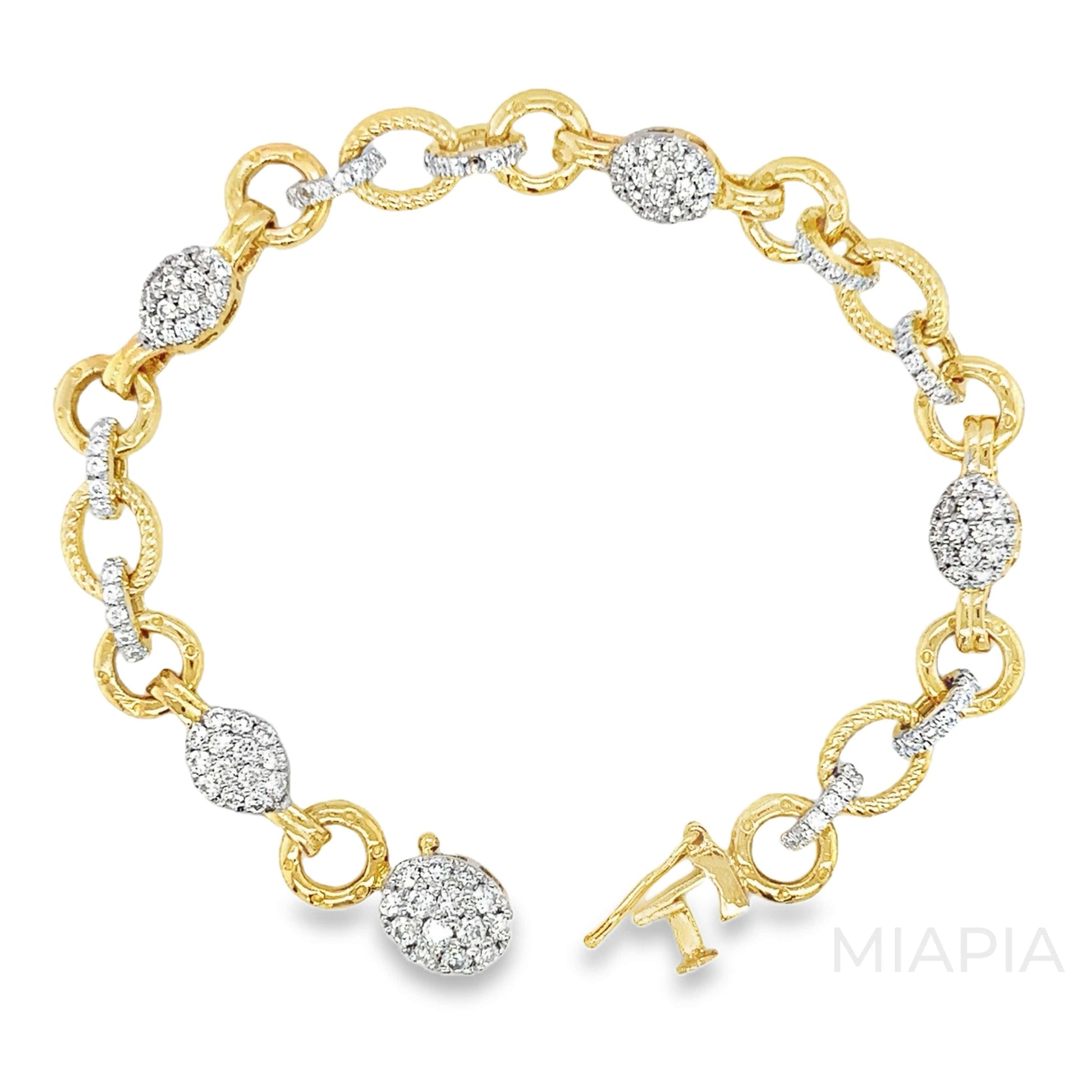Indulge in elegance with Miapia’s Luxe Link Charm Bracelet. This stunning piece features a series of interlocking gold links, adorned with alternating pavé moissanite discs that add a touch of shimmer to the design. The addition of a refined charm brings a playful yet sophisticated element, making this bracelet a true statement of luxury.