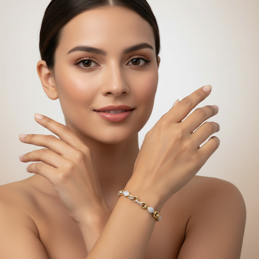 Designed for those who appreciate fine details and timeless style, the Luxe Link Charm Bracelet is versatile enough to pair with any outfit, elevating both everyday looks and evening wear. The mixture of textures and sparkle gives it a unique edge, while its adjustable clasp ensures a comfortable fit.