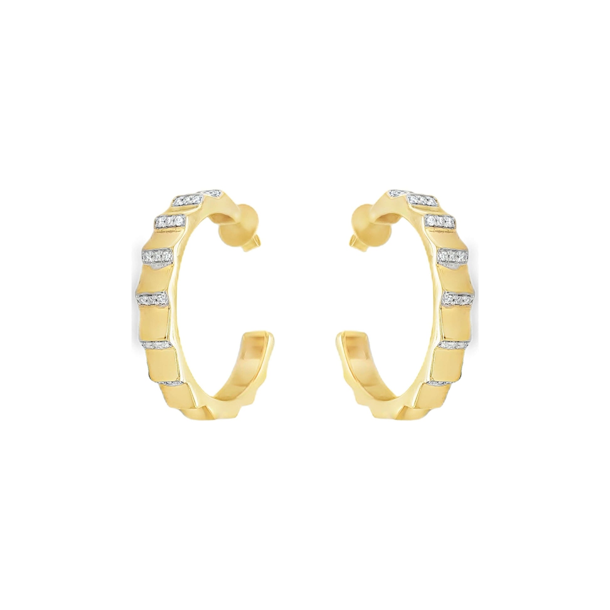 Add a modern twist to your jewelry collection with the Mosaic Cuff Hoops by Miapia. These demi-fine earrings feature an intricate geometric pattern in vermeil gold over sterling silver, accentuated with brilliant moissanites for a subtle sparkle. The open design and angular details make them a versatile choice for both daytime sophistication and evening glamour. Perfect for adding a touch of architectural elegance to your look.