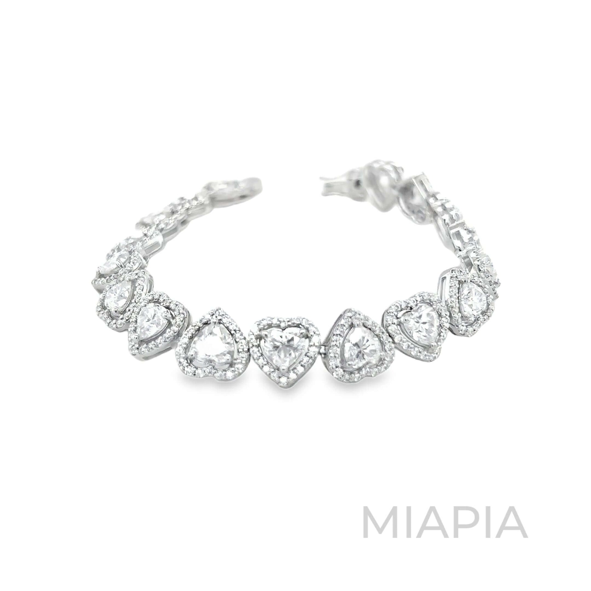 Celebrate love with the Heart Halo Bracelet by Miapia. This stunning design features heart-shaped moissanite diamonds, each framed by a halo of sparkling stones, creating a look that is both romantic and sophisticated. Crafted in rhodium-plated sterling silver, this bracelet combines timeless elegance with exceptional durability. Perfect for anniversaries, weddings, or any moment you want to make unforgettable, this bracelet exemplifies Miapia’s dedication to sustainable, demi-fine jewelry with luxurious appeal