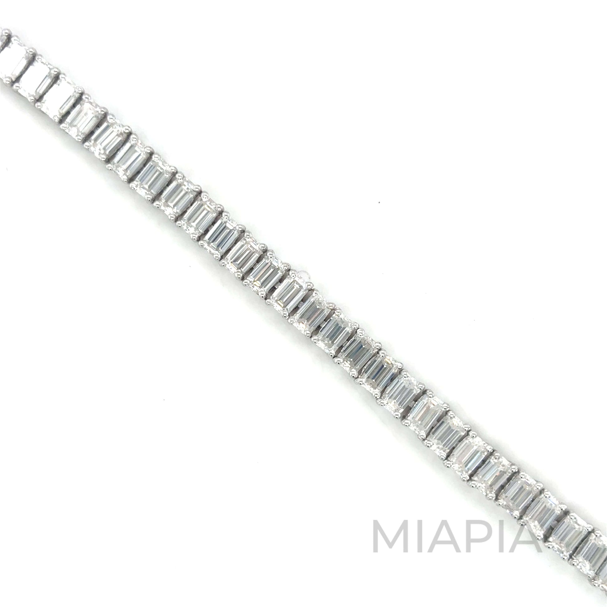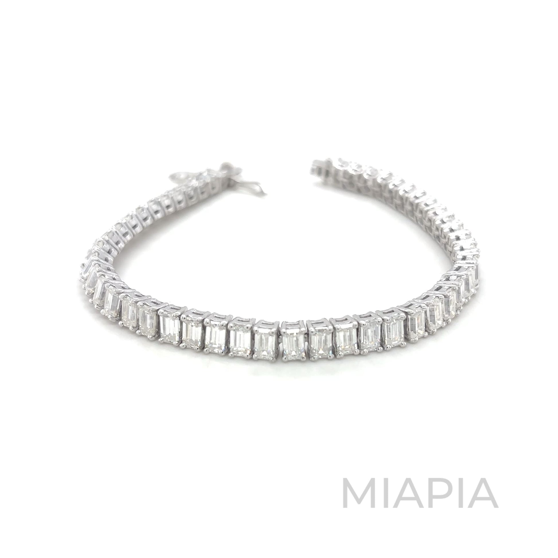 The Elysian Emerald Cut Tennis Bracelet by Miapia embodies refined luxury and contemporary sophistication. Featuring a continuous line of dazzling emerald-cut moissanites, this bracelet is crafted in rhodium-plated sterling silver for a timelessly radiant finish. Designed for those who appreciate sustainable, high-quality demi-fine jewelry, this piece captures Miapia’s commitment to elegance and craftsmanship.