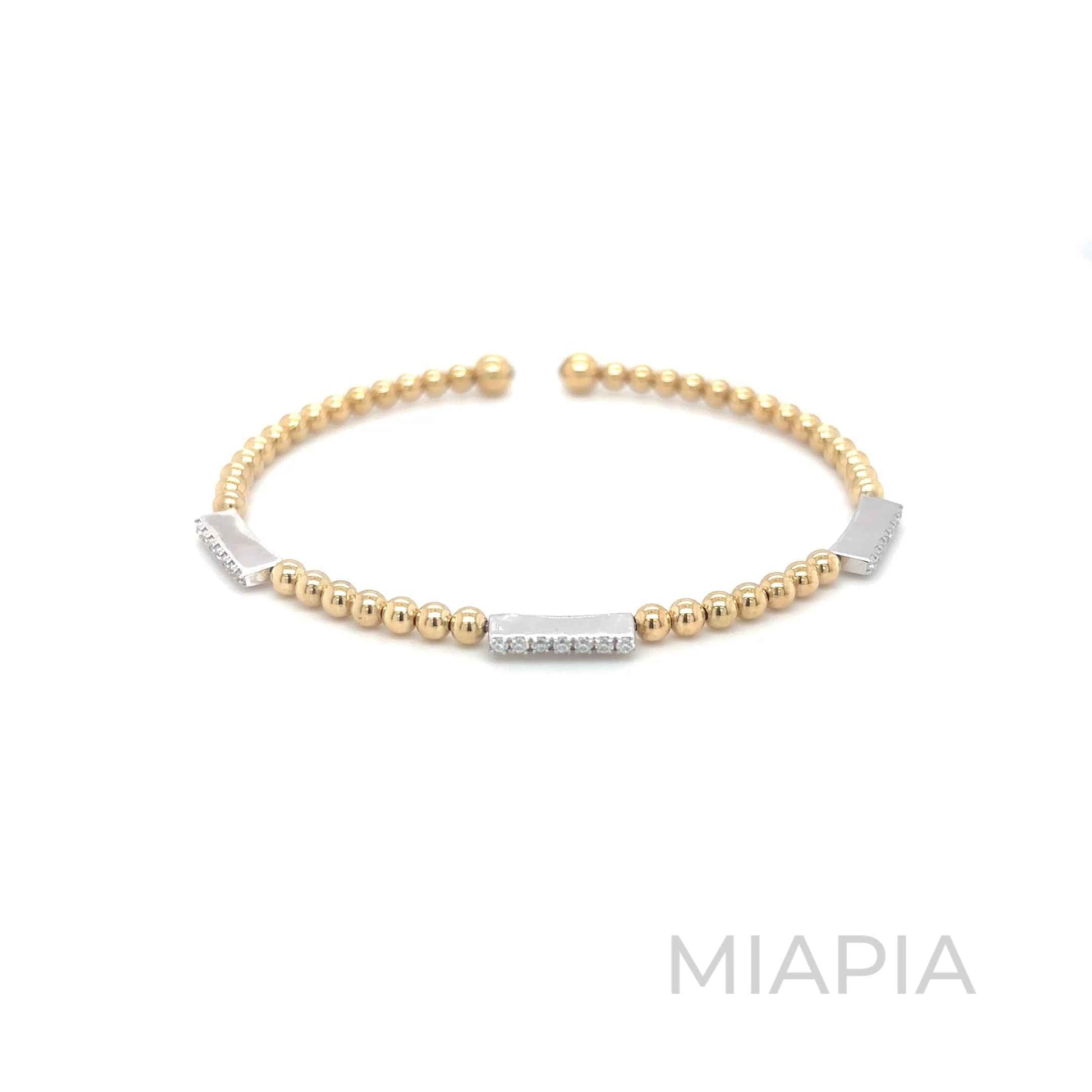 The Snap & Swirl Bracelet by Miapia features a striking trinity of moissanite charms with vermeil gold beads. A modern and elegant piece that elevates any look effortlessly.