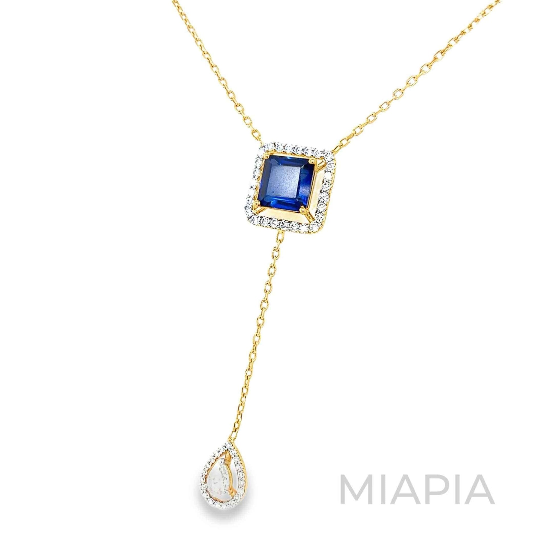 Elevate your style with Miapia’s Sapphire Radiance Necklace, a luxurious centerpiece for any collection. This captivating piece showcases a regal, square-cut blue sapphire framed by a halo of shimmering moissanite diamonds, set in vermeil gold over sterling silver. A delicate chain leads to an elegant pear-shaped moissanite drop, adding movement and brilliance to this sophisticated design. Perfect for formal occasions or adding a royal touch to your evening attire, this demi-fine necklace reflects Miapia’s dedication to timeless elegance and exceptional craftsmanship.