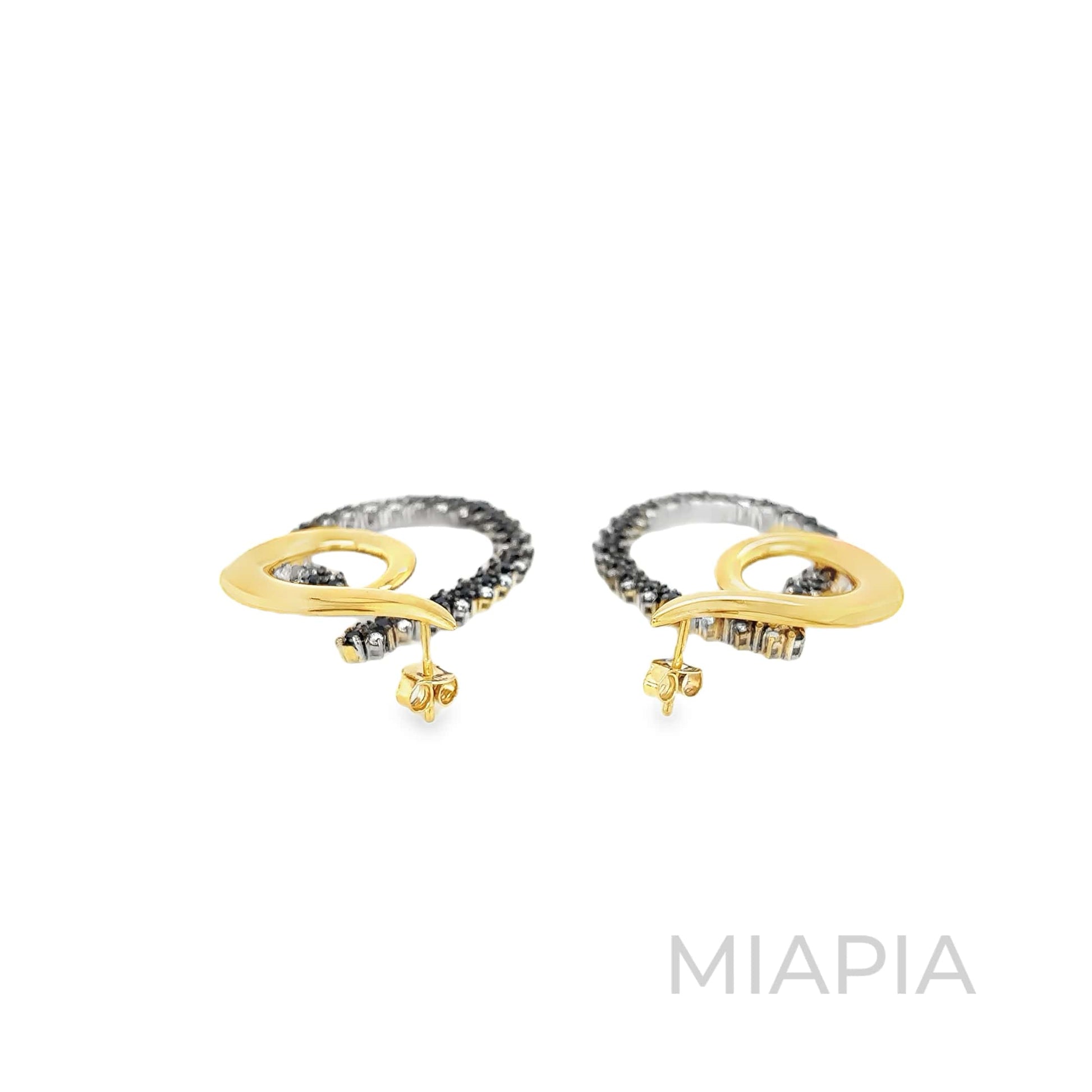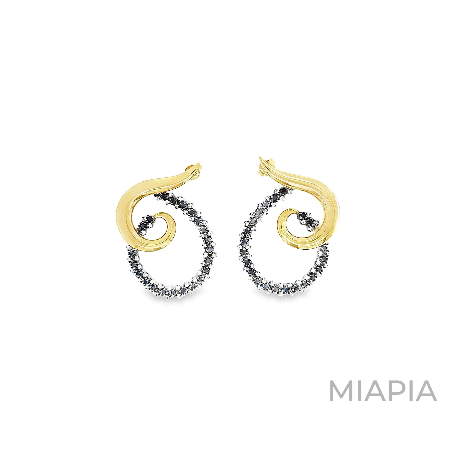 A striking fusion of elegance and edge, the Noir Swirl Earrings by Miapia feature graceful gold swirls paired with a dramatic arc of interspersed black gemstones and diamond moissanites. Crafted in vermeil gold over sterling silver, these earrings blend fluid design with bold contrast, creating a unique statement piece. Perfect for evening events or adding a sophisticated twist to your outfit, these demi-fine jewellery earrings exemplify Miapia’s commitment to sustainable luxury and modern style.
