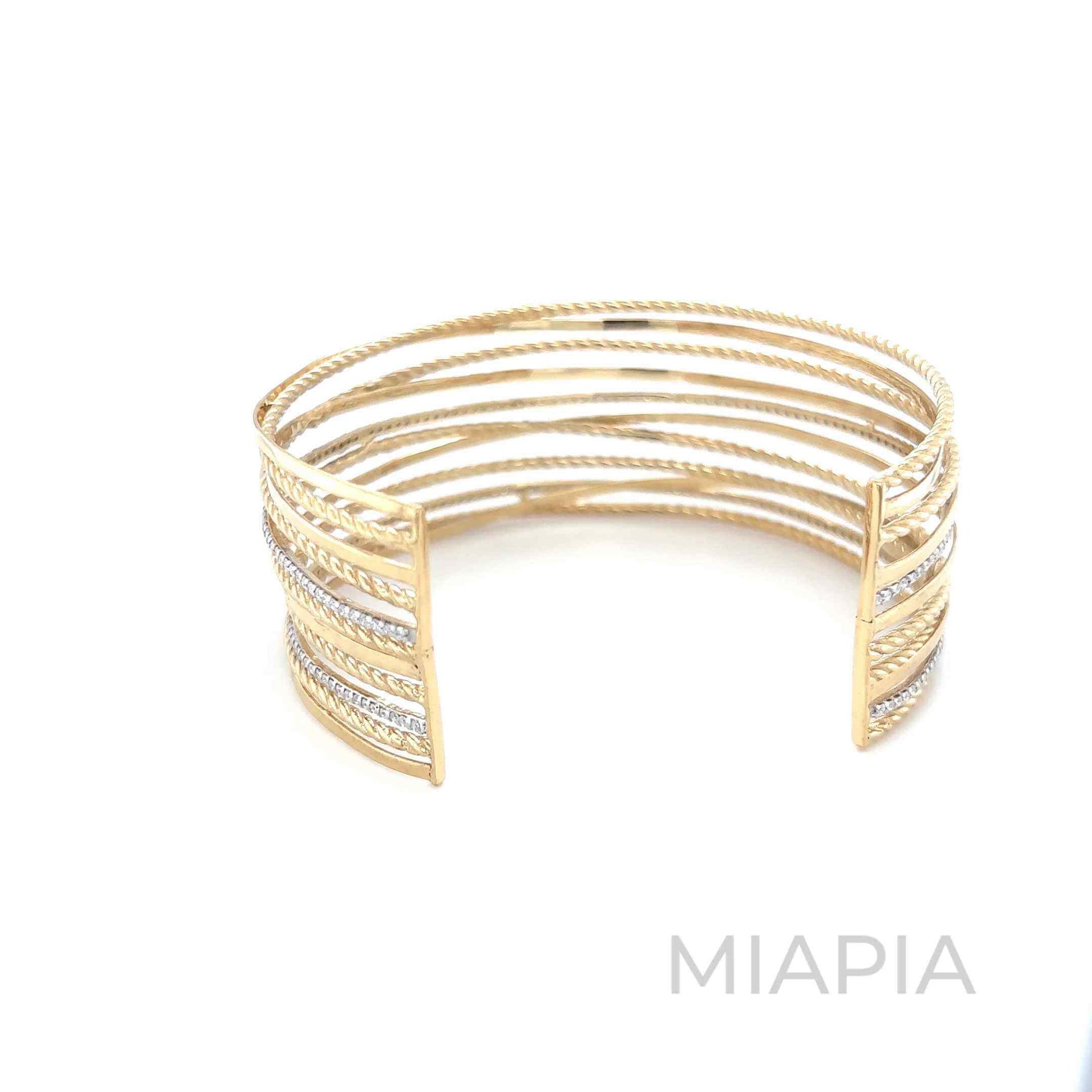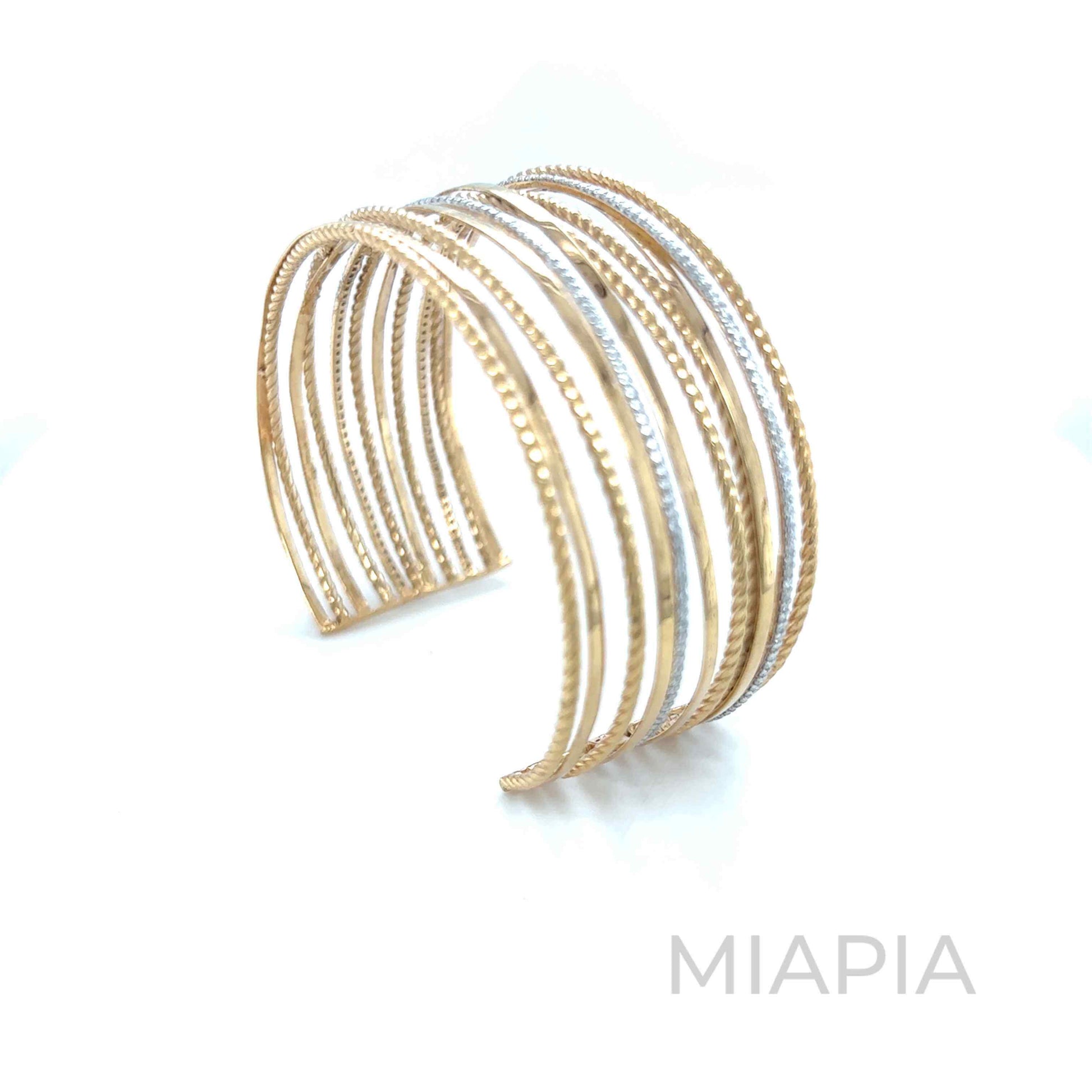 Wrap your wrist in timeless elegance with Miapia’s Orbit Luxe Cuff. Designed with intertwined bands of vermeil gold over sterling silver, this open cuff embodies sophistication with its textured detailing and contemporary style. A versatile piece that exudes effortless luxury, it reflects Miapia’s dedication to sustainable and affordable demi-fine jewelry.