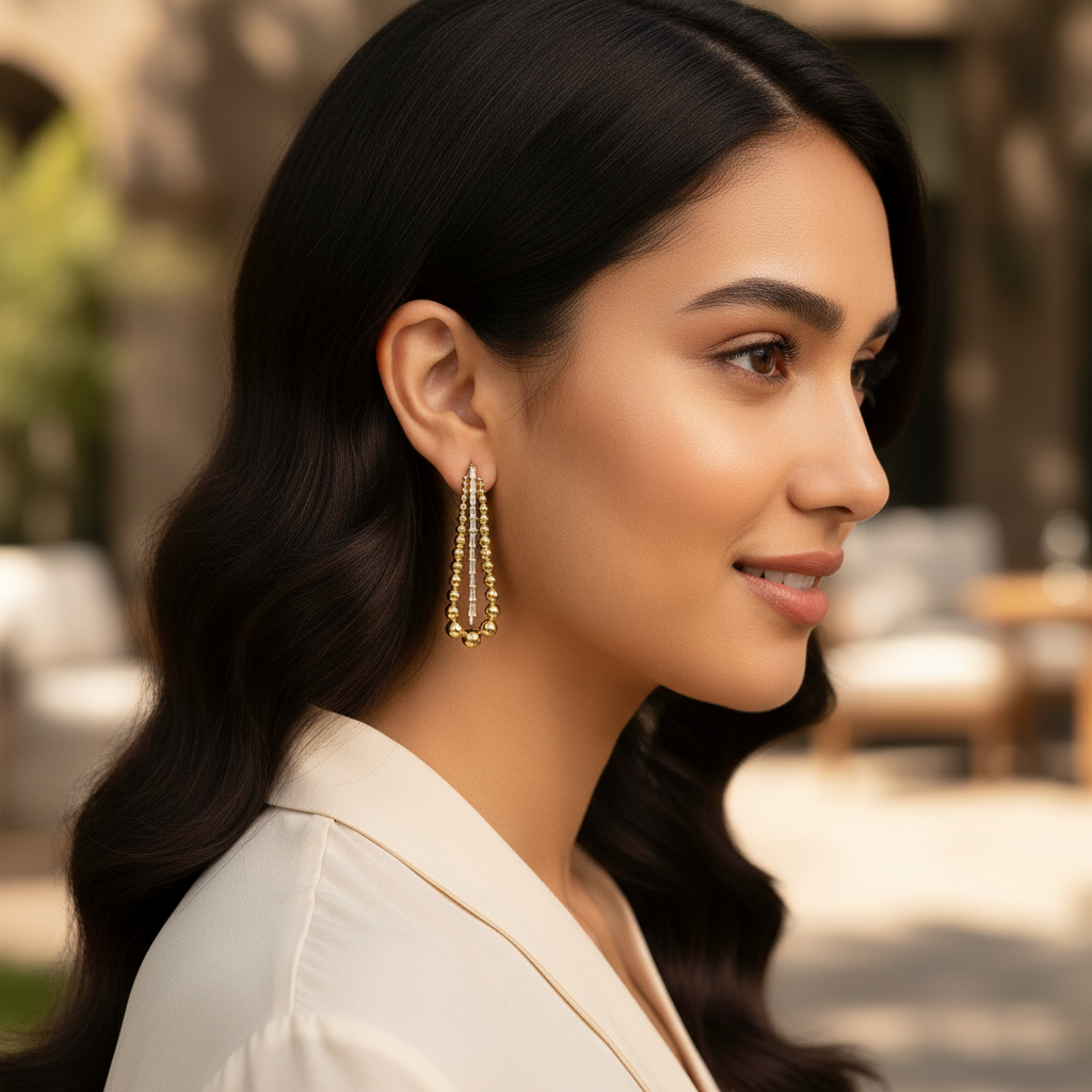 A symphony of elegance and contemporary design, the Radiant Tier Drop Earrings are crafted in vermeil gold over sterling silver, with a harmonious arrangement of polished spheres and sleek baguette moissanite-encrusted bars. These long, linear earrings gracefully elongate the neckline, making them a statement piece for both formal occasions and stylish evenings. Lightweight and sophisticated, they are an embodiment of Miapia’s dedication to demi-fine jewelry that redefines modern luxury.