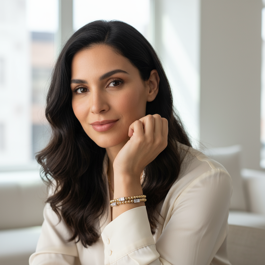 The Snap & Swirl Baguette Duo Bracelet by Miapia features a striking double-row design of vermeil gold beads adorned with baguette-cut moissanite charms. A modern and elegant piece that elevates any look effortlessly.
