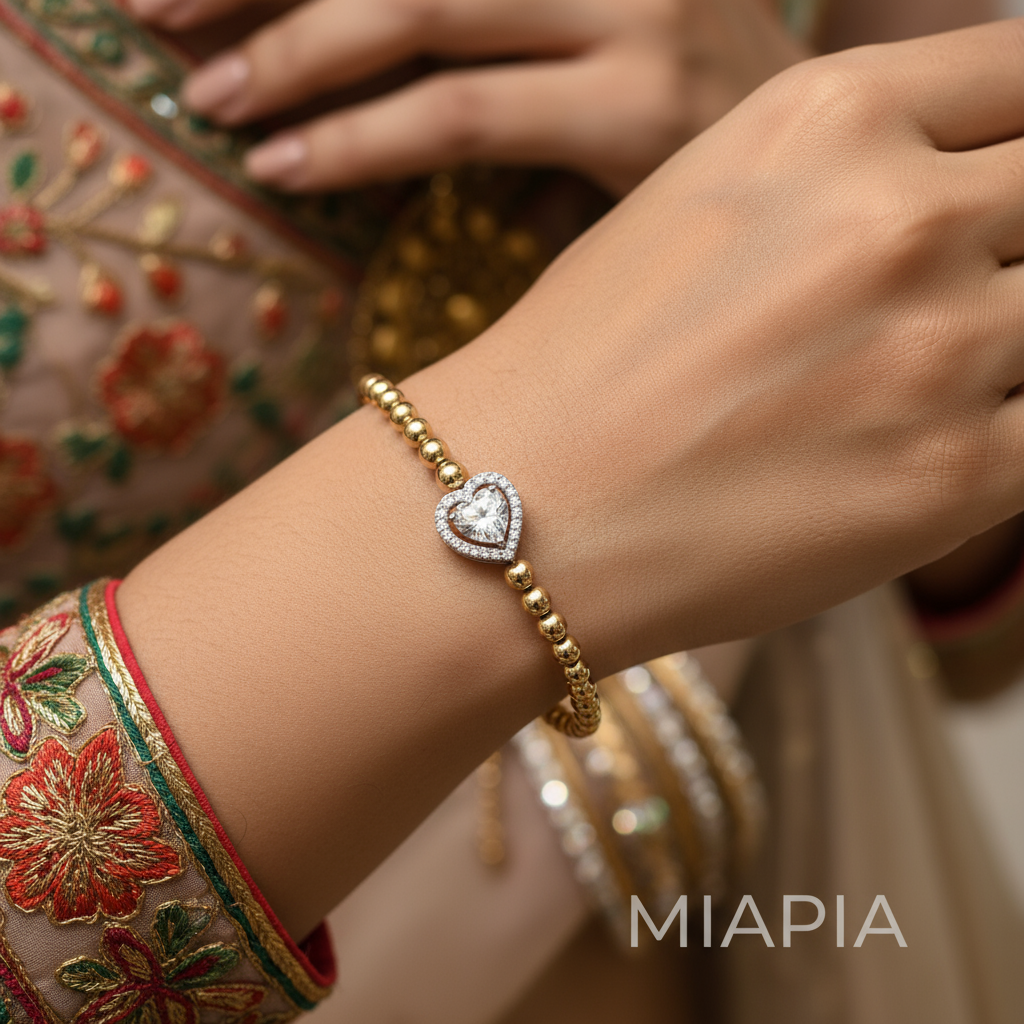 The Snap & Swirl Heart Halo Bracelet by Miapia features radiant vermeil gold beads and a dazzling heart-shaped moissanite solitaire surrounded by a brilliant halo. A romantic and elegant addition to your jewelry collection.