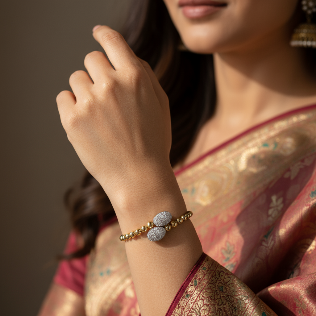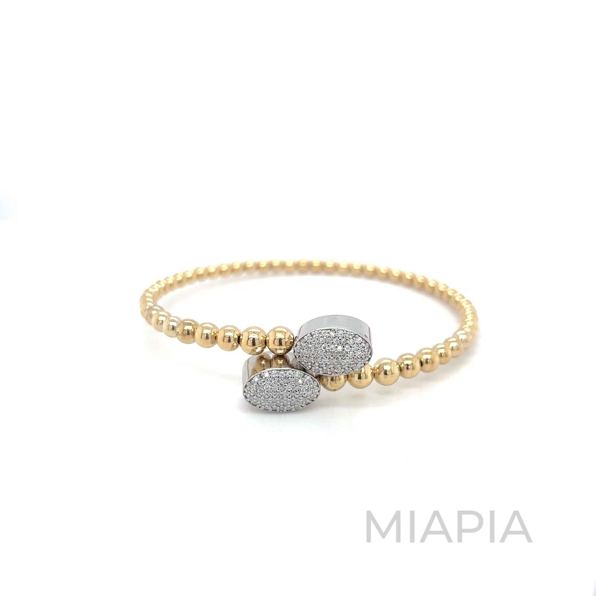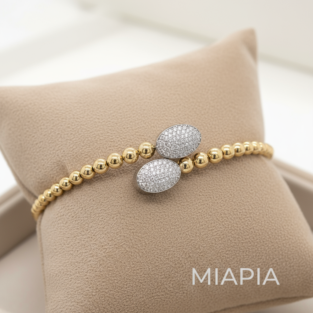 The Snap & Swirl Oval Charm Bracelet by Miapia features lustrous vermeil gold beads complemented by pave-set moissanite oval charms. A graceful piece that exudes modern elegance.