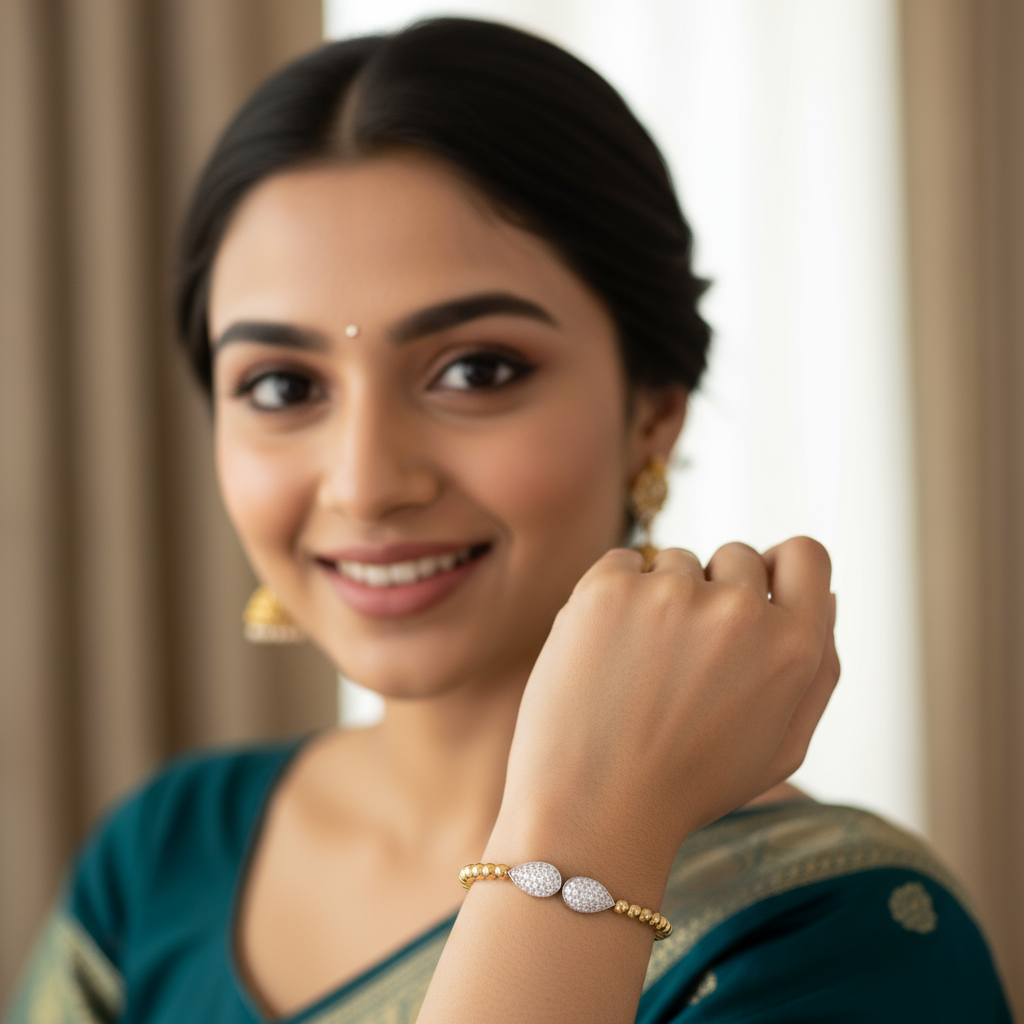 The Snap & Swirl Teardrop Bracelet by Miapia features a string of vermeil gold beads, beautifully finished with pave-set moissanite teardrop charms. A delicate yet striking piece, perfect for effortless elegance.