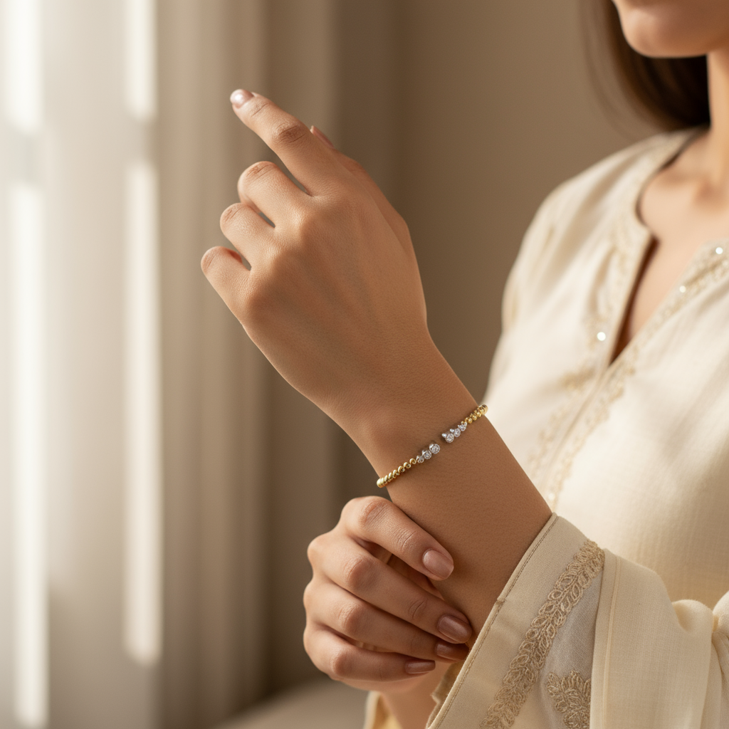 The Sparkle Bead Bracelet from Miapia’s Snap & Swirl collection is a dazzling blend of elegance and innovation. Featuring a sleek spring design crafted in vermeil gold over sterling silver, this bracelet is adorned with a series of polished beads interspersed with shimmering moissanite accents. The dynamic arrangement adds depth and brilliance, making it a versatile accessory for every occasion. Perfectly combining contemporary design with demi-fine luxury, this bracelet is your go-to piece for a sophisticated, modern statement.