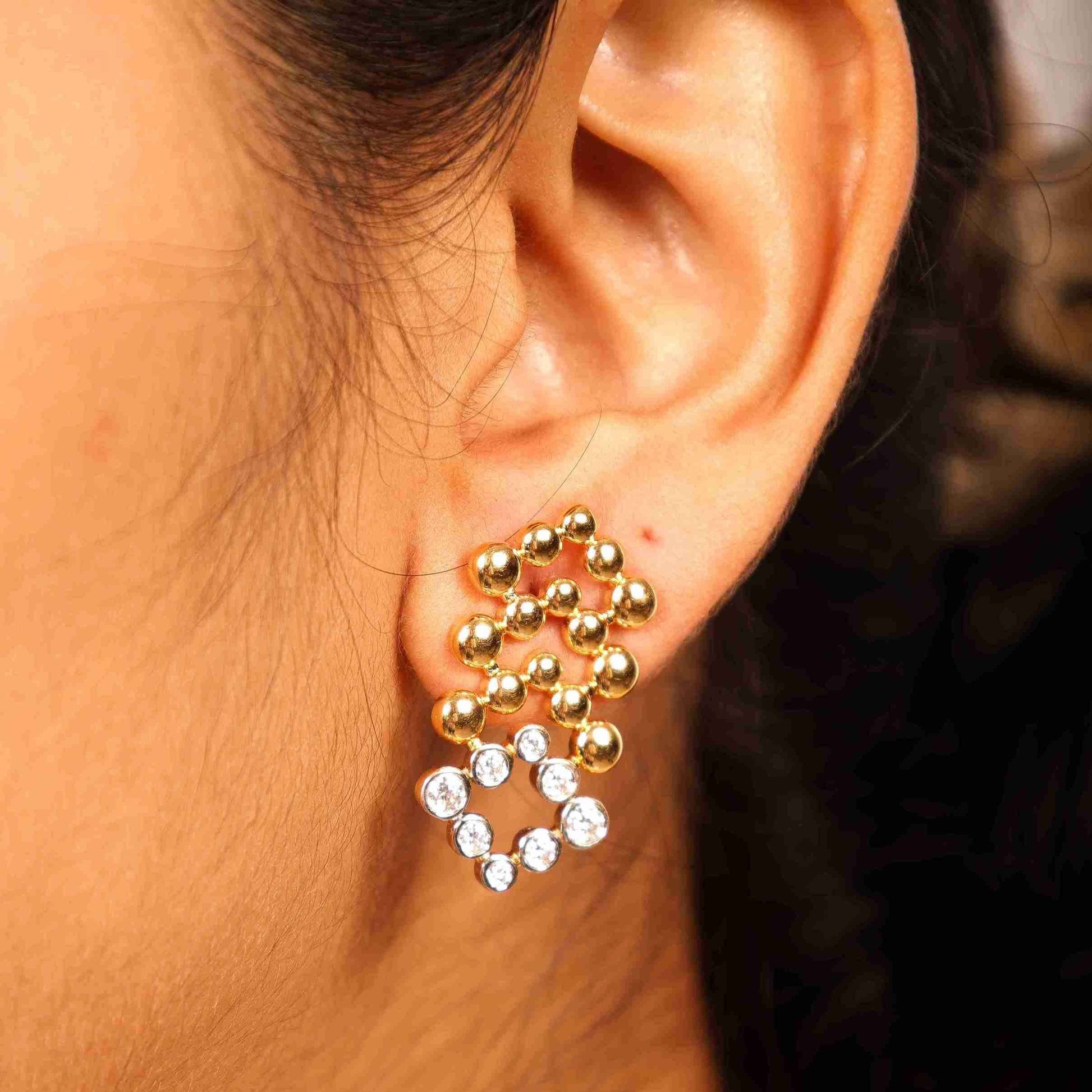 The Stardust Cluster Earrings by Miapia are a harmonious blend of whimsy and elegance. Featuring a cascading array of golden and silver-toned spheres adorned with dazzling Moissanite diamonds, these earrings create a radiant play of light with every movement. Meticulously crafted from vermeil gold over sterling silver, they capture the essence of modern glamour while staying true to Miapia’s commitment to sustainable demi-fine jewelry. Perfect for adding a celestial touch to any outfit, these earrings effortlessly transition from day to night, ensuring you shine in every moment.