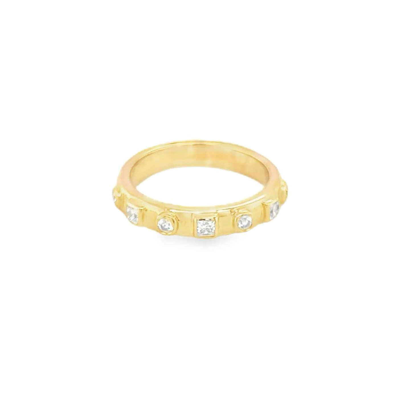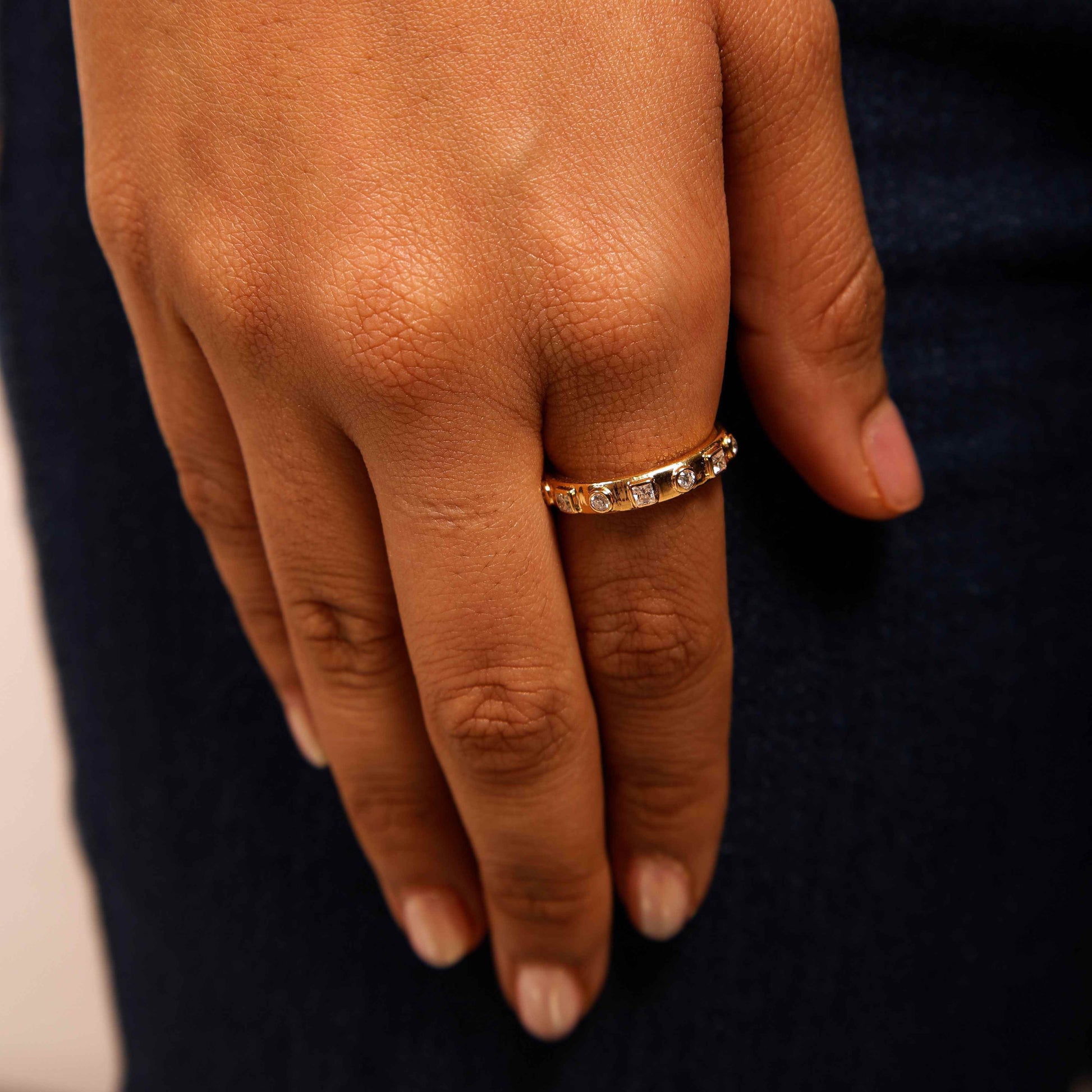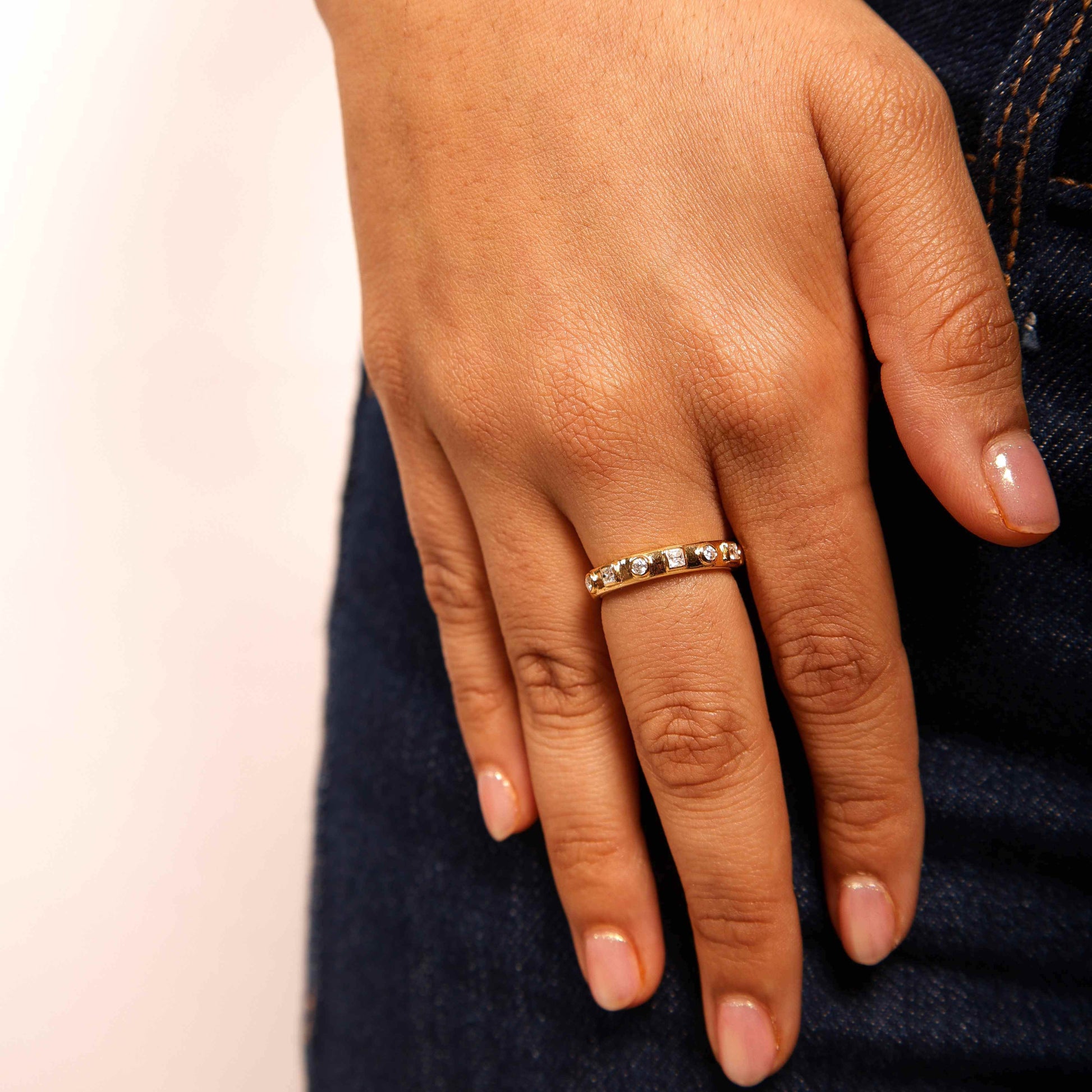 The Starlit Band by Miapia is a timeless treasure that exudes understated elegance. Featuring a series of perfectly spaced moissanite diamonds, this ring is crafted in vermeil gold over sterling silver, delivering a luxurious yet minimalist design. Its slim profile makes it ideal for stacking or wearing solo as a refined statement. A versatile addition to your demi-fine jewellery collection, perfect for both daily wear and special occasions.