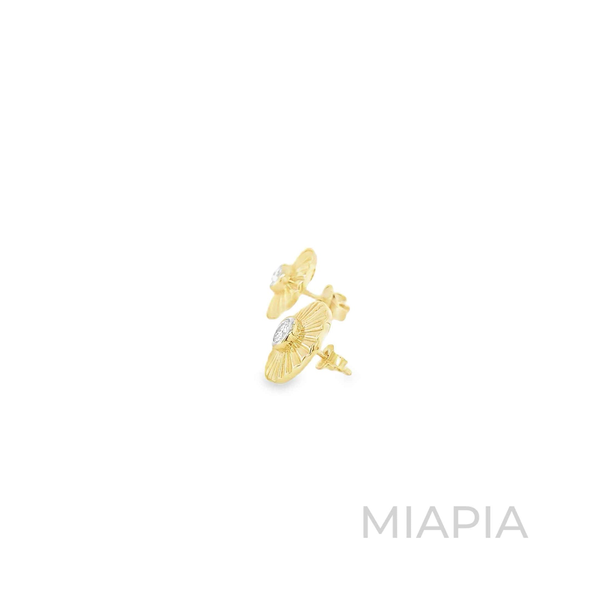 The Sunbeam Studs by Miapia capture the warmth and brilliance of sunlight in a compact design. Featuring a radiant sunburst pattern crafted in vermeil gold over sterling silver, these studs are adorned with sparkling moissanite diamonds at the center for a dazzling effect. Perfect for brightening up your everyday looks or complementing evening attire, these earrings reflect the perfect blend of elegance and sophistication that defines Miapia’s demi-fine jewelry.