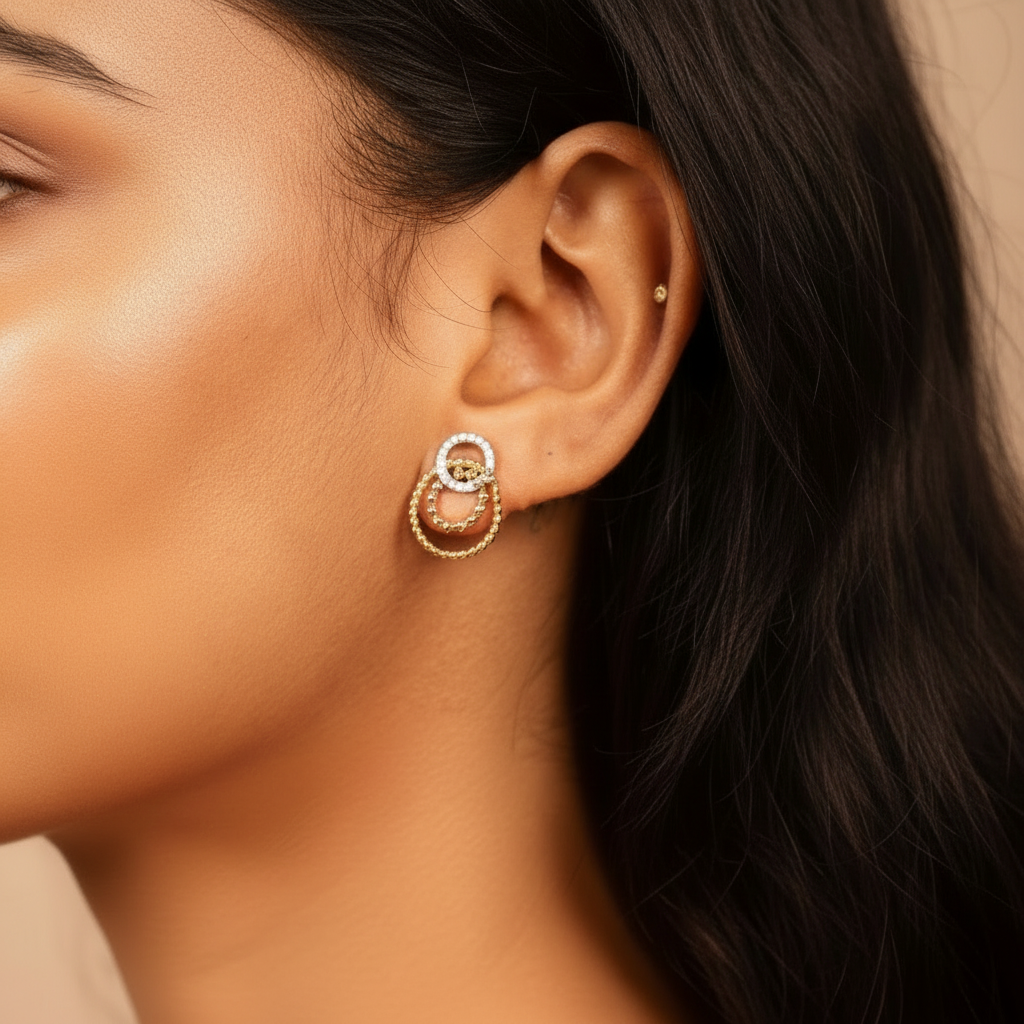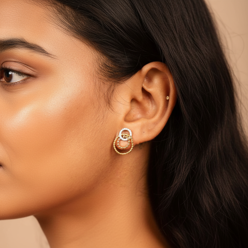 Redefine elegance with Miapia’s Tricolor Harmony Circles. These exquisite earrings feature interlocking circles in vermeil gold, rose gold, and rhodium-plated sterling silver, celebrating a harmonious blend of tones. Accentuated with sparkling moissanite diamonds, these sophisticated circle earrings add a refined yet playful touch to any outfit, making them a versatile addition to your demi-fine jewellery collection.