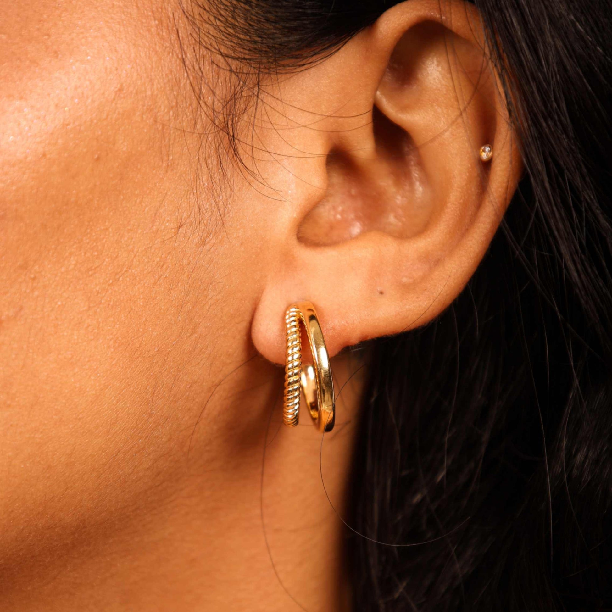 The Twist Duo Hoops by Miapia blend classic and contemporary aesthetics in a seamless design. Featuring a dynamic combination of vermeil gold over sterling silver and rose gold vermeil twisted accents, these earrings create a stunning contrast that adds depth and character. The double-hoop structure brings a layered elegance, perfect for making a subtle yet stylish statement. Lightweight and versatile, these demi-fine jewellery pieces are ideal for both day-to-night transitions, embodying Miapia’s dedication to sustainable luxury and refined craftsmanship.